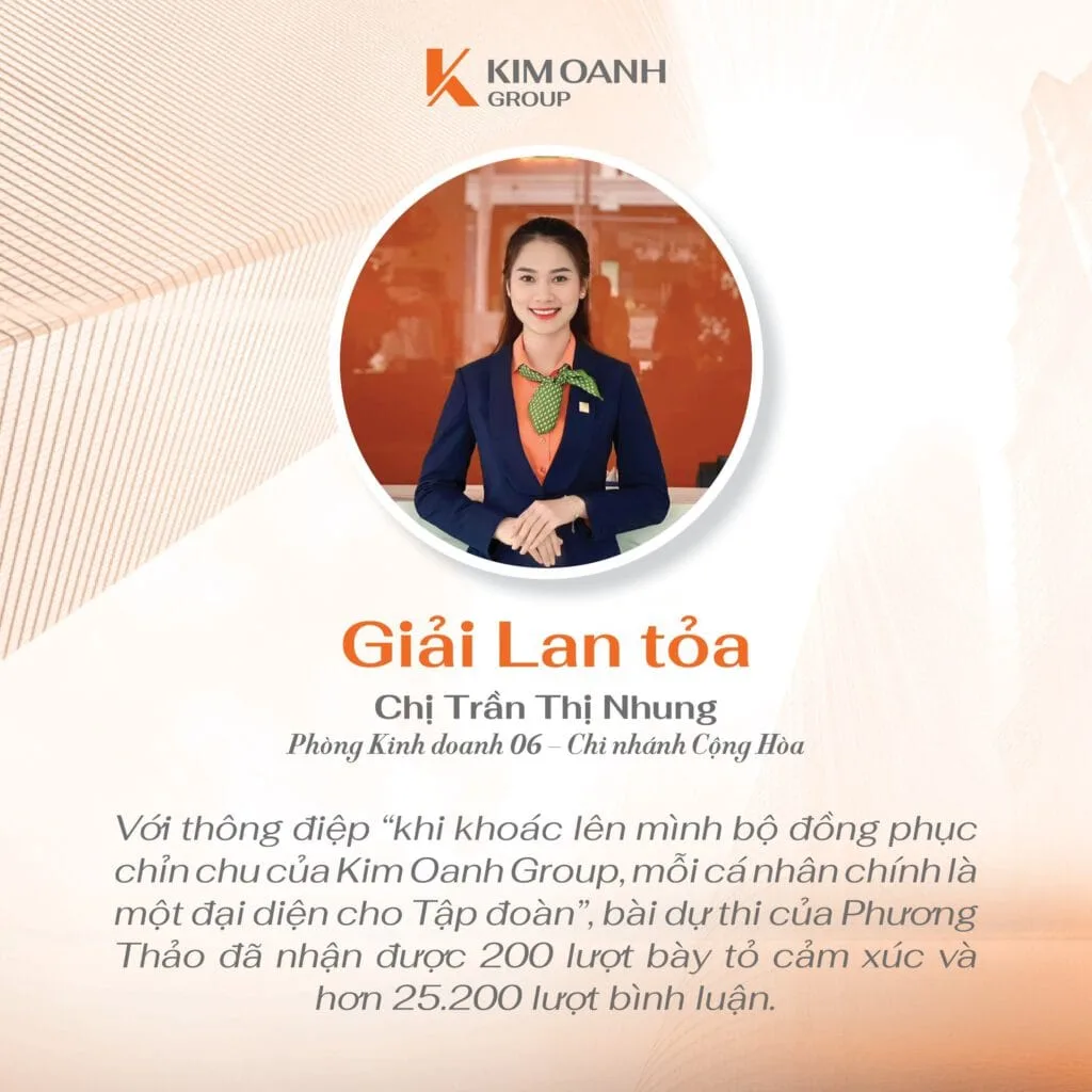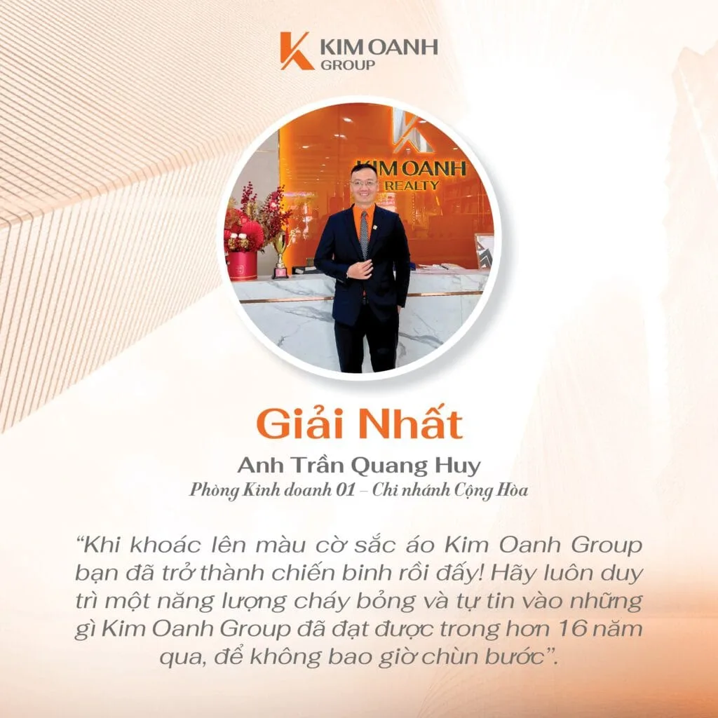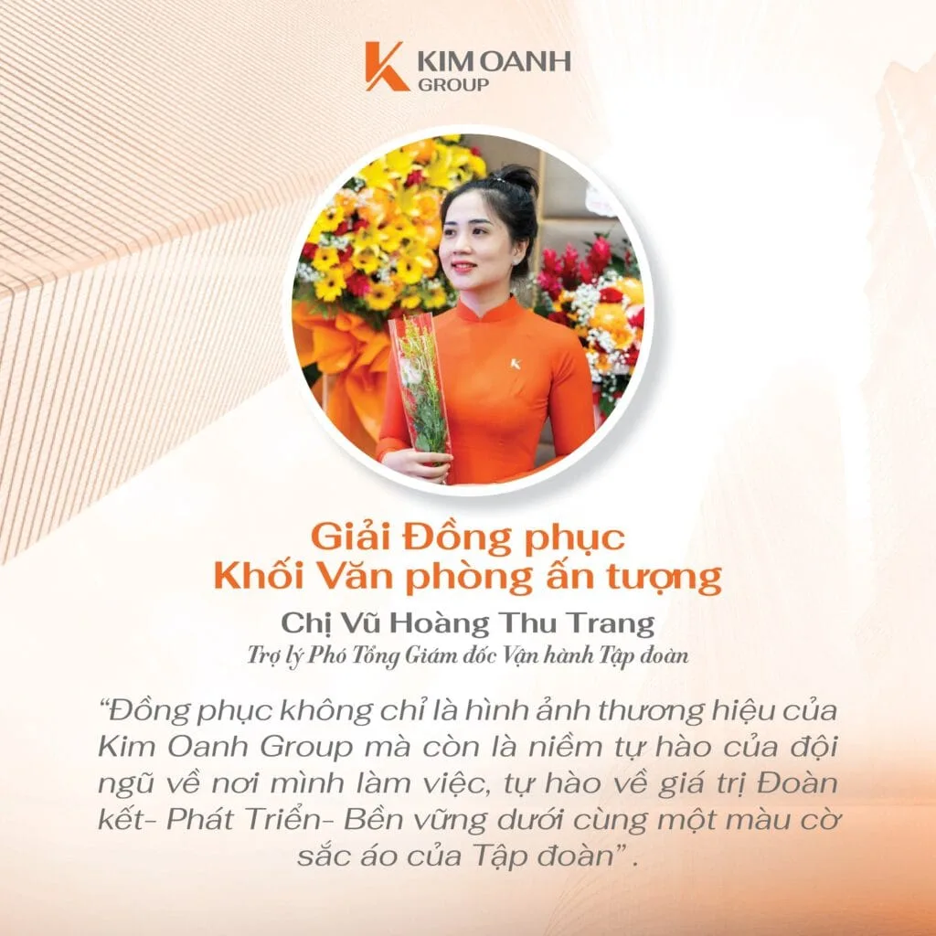 “Đã là cuộc thi thì hẳn sẽ có người đạt giải, có người chưa đạt giải nhưng trong vai trò Trưởng Ban giám khảo, tôi nhận thấy rằng tất cả bài thi đều chất lượng và xứng đáng được trao thưởng. Có lẽ giải thưởng giá trị nhất chính là sự ghi nhận của toàn hệ thống đối với bài thi của các bạn. Còn trong vai trò là lãnh đạo Tập đoàn, tôi đánh giá cao những giá trị mà cuộc thi đã đem lại và vô cùng tự hào với tinh thần lan tỏa cũng như tình yêu, sự cống hiến mà đội ngũ nhân sự dành cho Kim Oanh Group” – bà Nguyễn Ngọc Ánh chia sẻ.