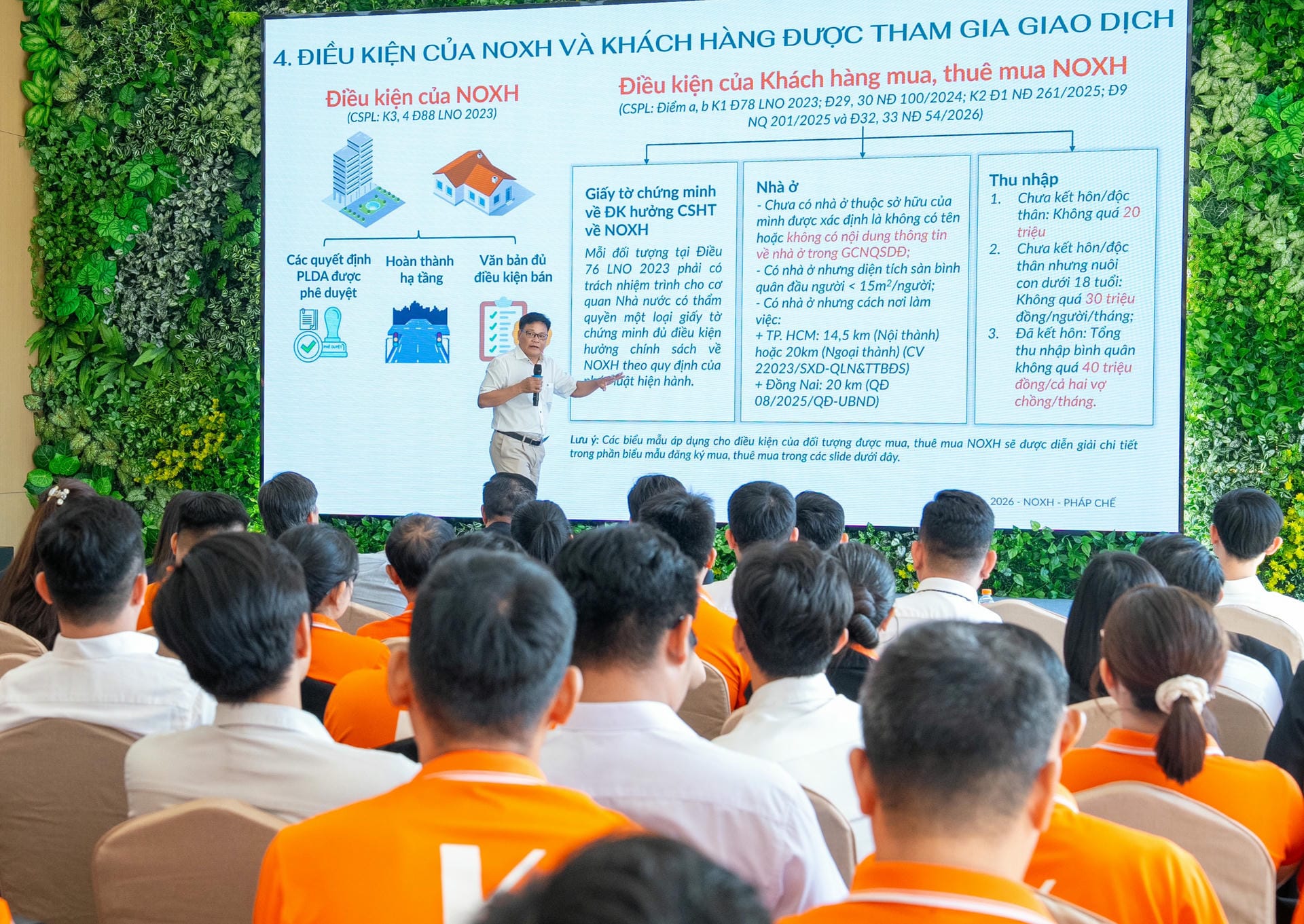 Cập nhật những điểm mới đáng chú ý trong quy định pháp lý liên quan đến NOXH, ông Phan Thành Đông – Giám đốc Khối Pháp chế Kim Oanh Group cho biết một trong những thay đổi quan trọng là quy trình thẩm định giá bán đã được điều chỉnh rút ngắn thời gian. Theo đó, chủ đầu tư được chủ động xây dựng và phê duyệt giá trình cơ quan quản lý nhà nước để thực hiện hậu kiểm, thay vì phải chờ Sở Xây dựng thẩm định như trước đây. Bên cạnh đó, chính sách NOXH dự kiến từ ngày 1.7.2026 sẽ bổ sung thêm đối tượng được hưởng chính sách là gia đình có từ hai con trở lên nhằm hỗ trợ chính sách dân số. Ngoài ra, trường hợp khách hàng đã có đất nhưng trên giấy chứng nhận quyền sử dụng đất chưa thể hiện thông tin về nhà ở vẫn có thể được xem xét thuộc diện mua NOXH.