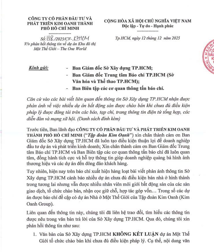Liên quan đến các bài viết phản ánh nội dung cảnh báo của Sở Xây dựng TP. Hồ Chí Minh về tình trạng một số dự án chưa đủ điều kiện nhưng bị môi giới chào bán, đại diện Kim Oanh Group khẳng định: văn bản của Sở Xây dựng không kết luận dự án Khu đô thị Một Thế Giới có hành vi chào bán trái quy định, mà phản ánh thực trạng hoạt động môi giới trên thị trường, đồng thời khuyến nghị nhà đầu tư và người mua nhà nâng cao cảnh giác.