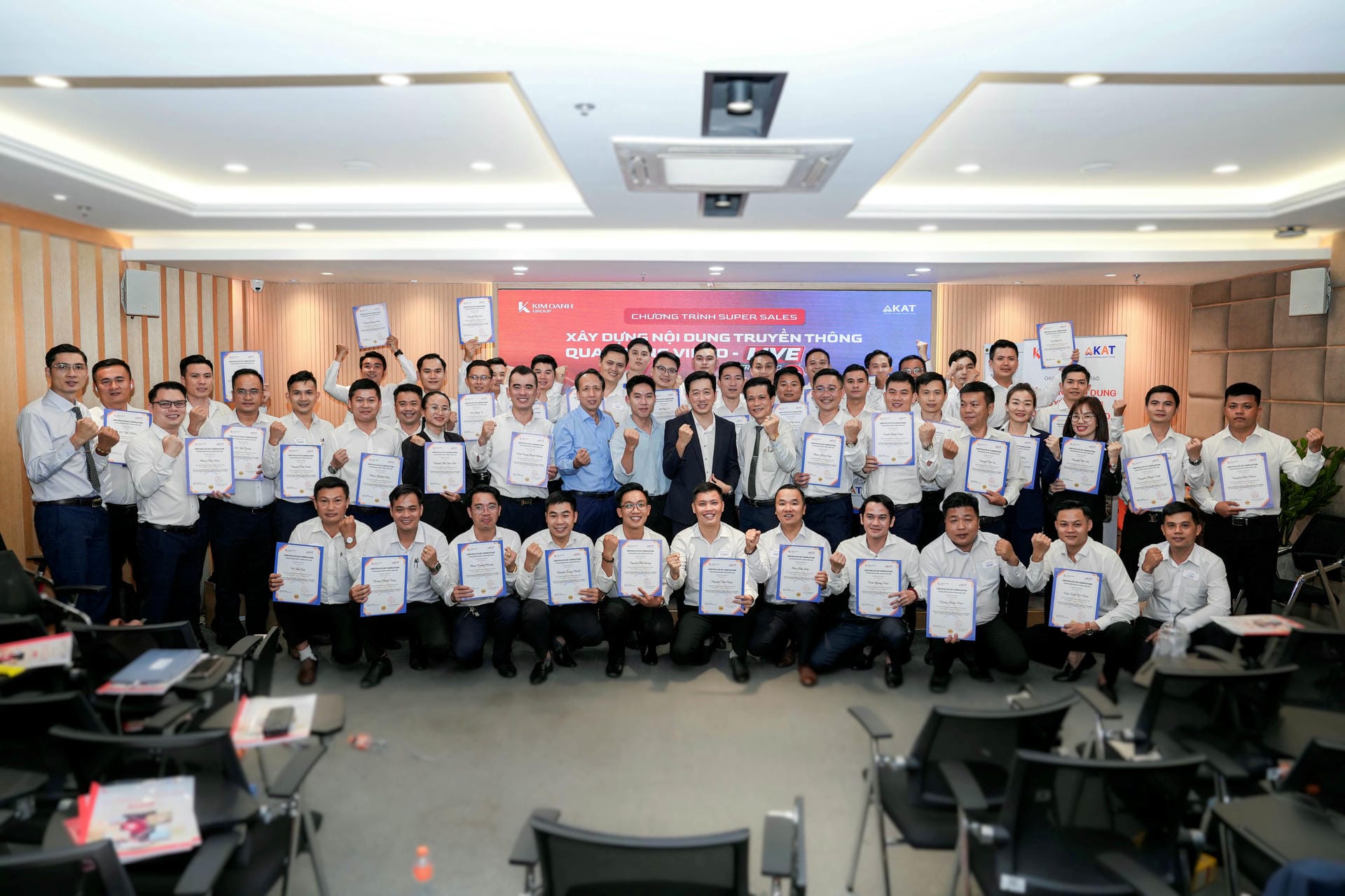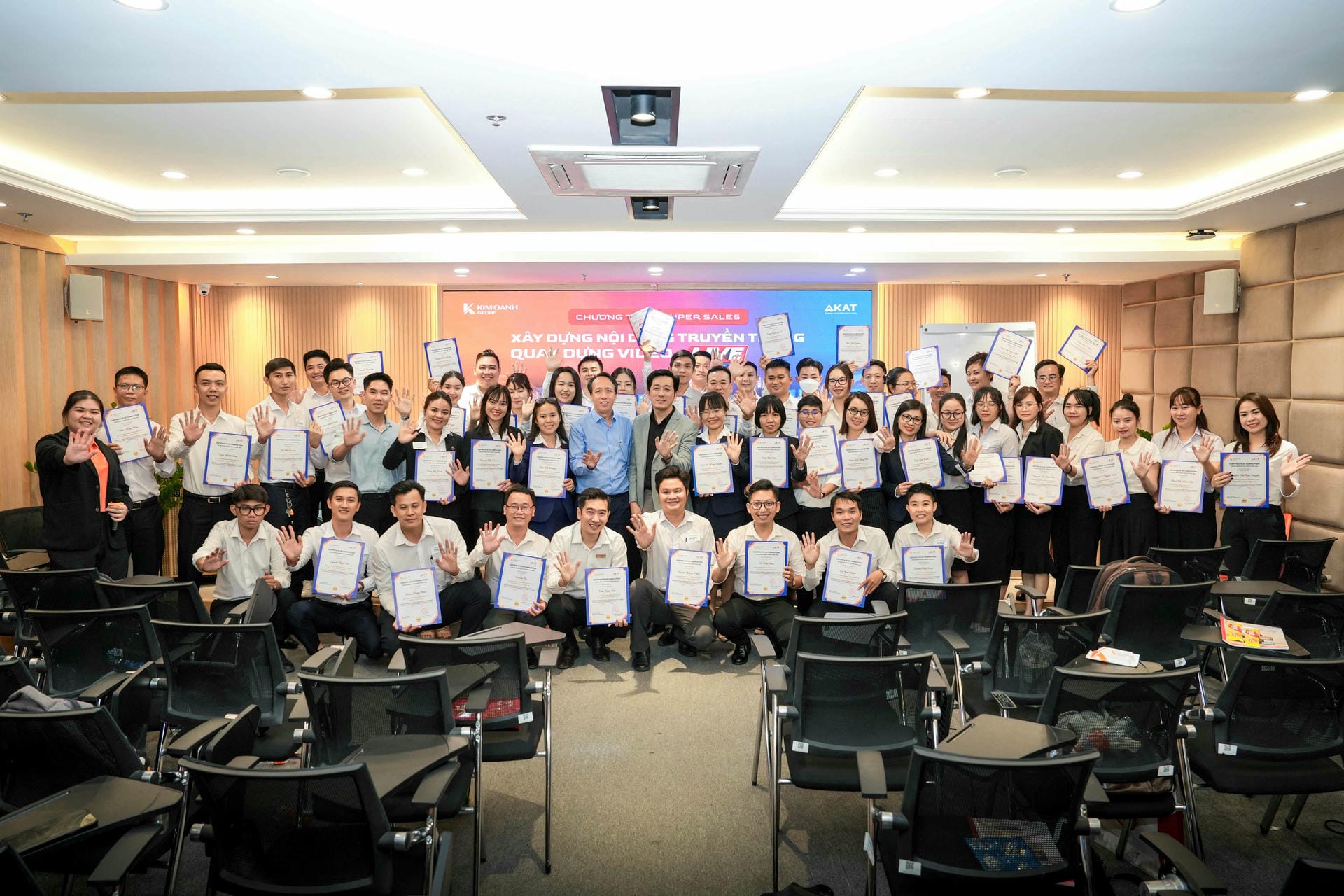 Nhằm nâng cao năng lực bán hàng hiện đại, từng bước thích ứng mạnh mẽ với làn sóng chuyển đổi số, Kim Oanh Group đã phối hợp cùng Học viện đào tạo kỹ năng AKAT triển khai chuỗi khóa đào tạo xây dựng nội dung truyền thông, quay dựng video, livestream thực chiến dành riêng cho đội ngũ kinh doanh. Sau 3 khóa học sôi nổi, 165 chiến binh của Tập đoàn đã chính thức “về đích” với nhiều trải nghiệm ấn tượng, sẵn sàng trở thành những super sales chuyên nghiệp.
