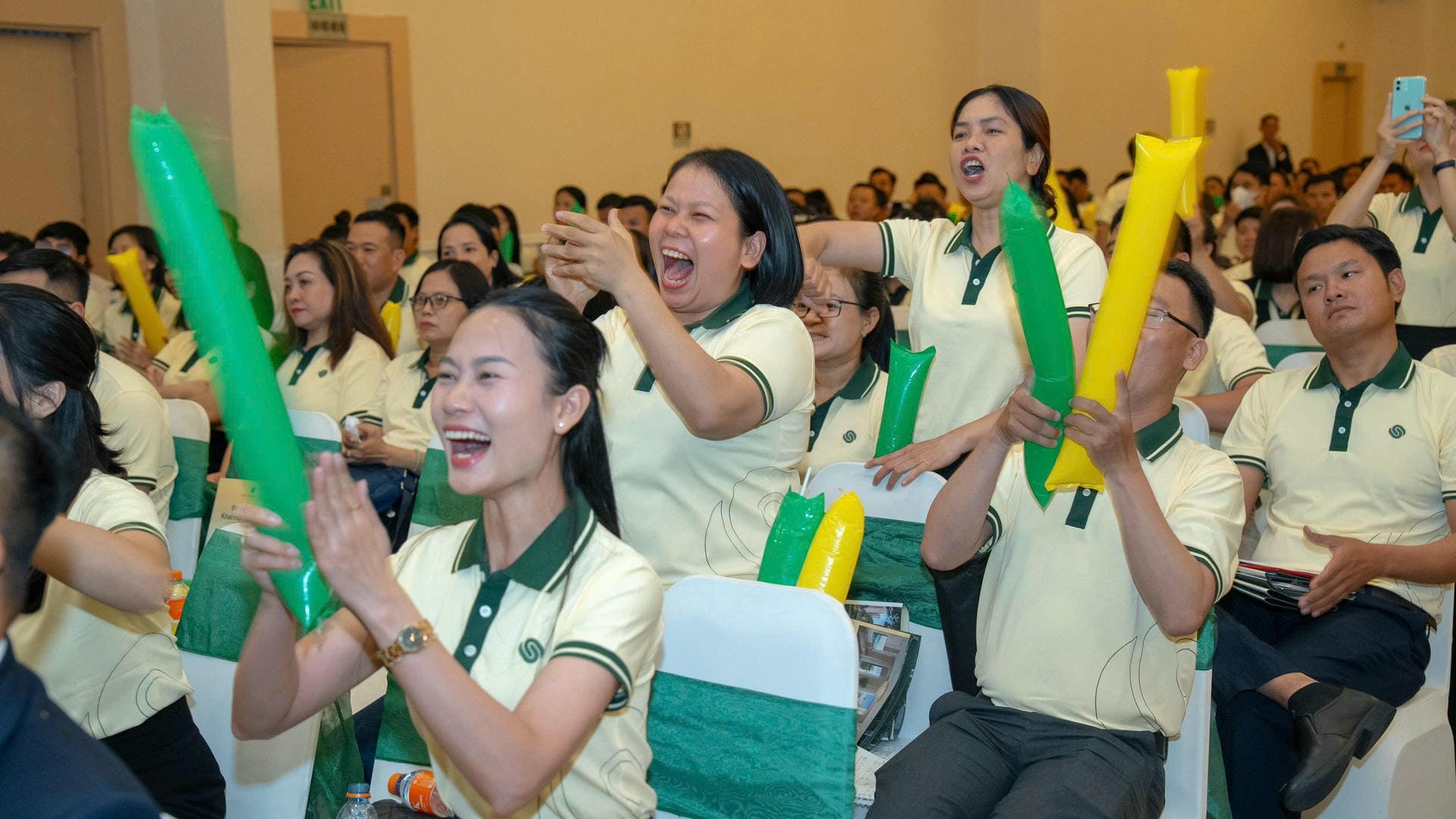 Sự phấn khích của các chiến binh kinh doanh khi nghe công bố chính sách hỗ trợ marketing và thưởng kinh doanh hiệu quả.