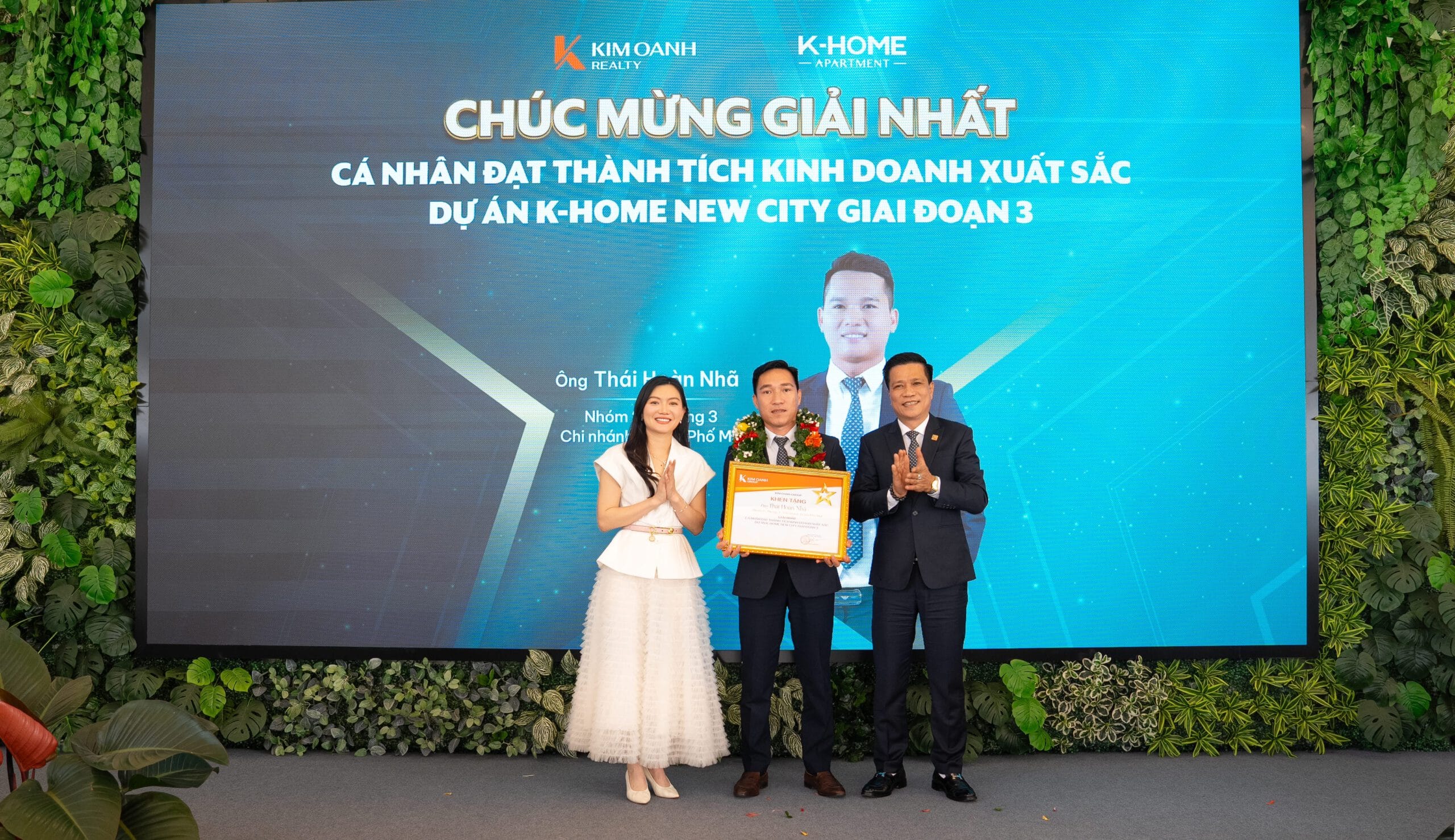 Những cá nhân xuất sắc góp phần làm nên thành tích ấn tượng của chiến dịch K-Home New City giai đoạn 3 đã được xướng tên tại buổi lễ. Trong ảnh, bà Nguyễn Ngọc Ánh và ông Tô Duy Chinh – Giám đốc Khối Kinh doanh trao Giải Nhất cá nhân đạt thành tích kinh doanh xuất sắc cho ông Thái Hoàn Nhã – Nhóm 2 – Phòng 3 – Chi nhánh Thành Phố Mới.