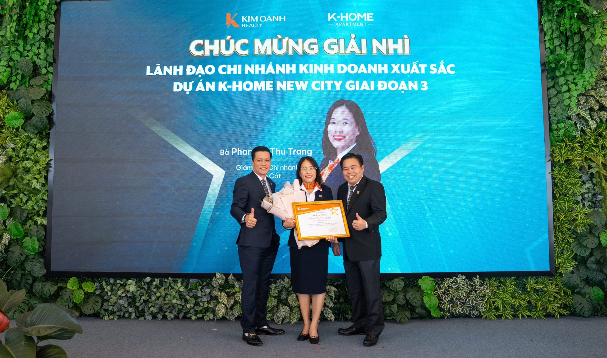 Ông Đoàn Vũ Phong và ông Tô Duy Chinh trao Giải Nhì hạng mục Lãnh đạo chi nhánh kinh doanh xuất sắc trong chiến dịch K-Home New City giai đoạn 3 cho bà Phan Thị Thu Trang – Giám đốc Chi nhánh Bến Cát.