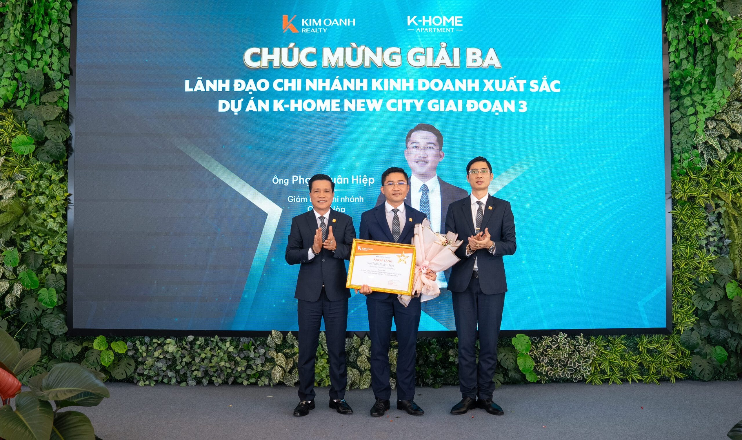 Ông Tô Duy Chinh và ông Bùi Anh Đức trao Giải Ba hạng mục Lãnh đạo chi nhánh kinh doanh xuất sắc trong chiến dịch K-Home New City giai đoạn 3 cho ông Phạm Xuân Hiệp – Giám đốc Chi nhánh Cộng Hòa.