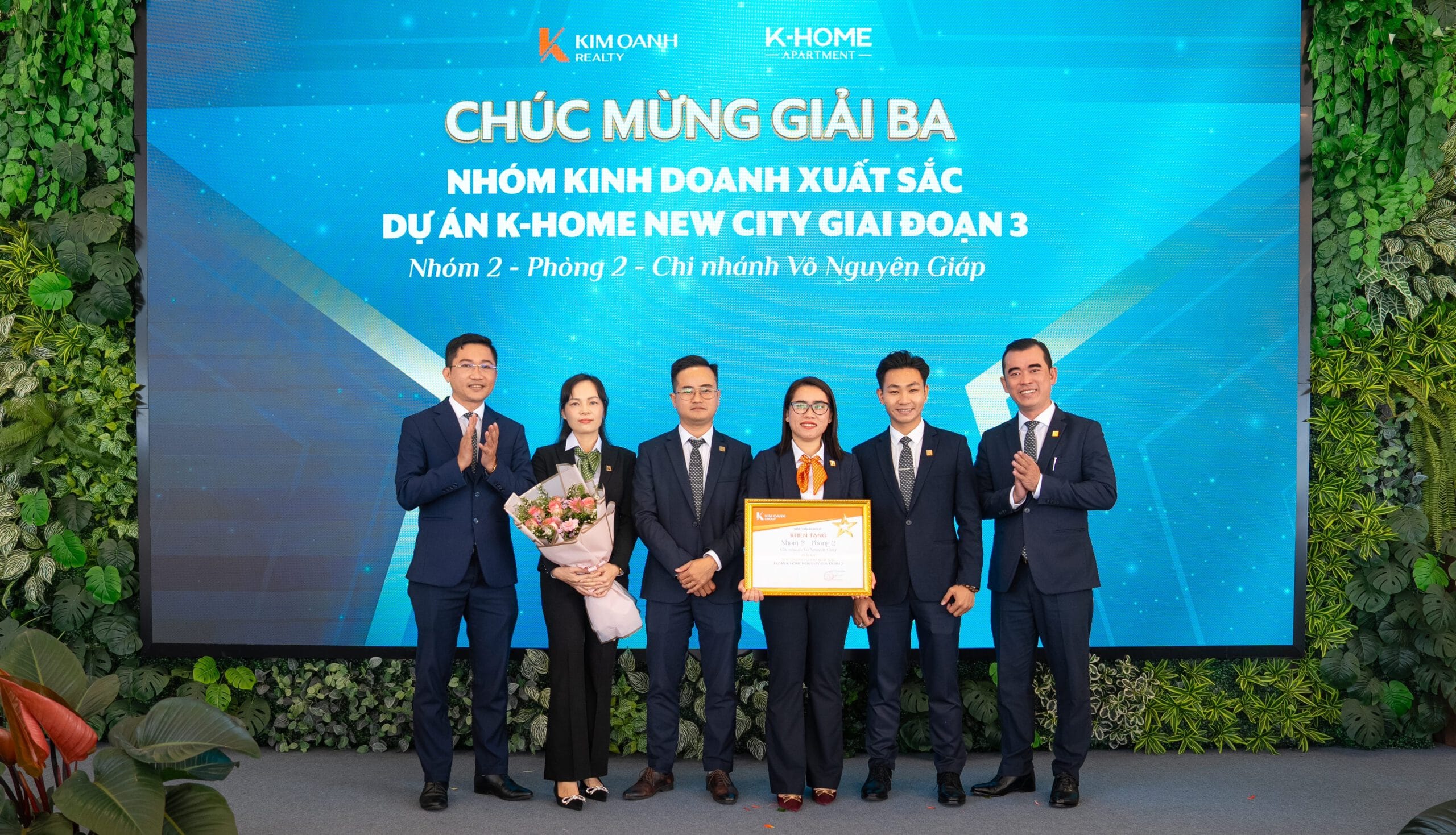 Ông Phạm Xuân Hiệp và ông Trần Trọng Minh Hoàng – Giám đốc Chi nhánh Võ Nguyên Giáp trao giải Ba hạng mục Nhóm kinh doanh xuất sắc trong chiến dịch K-Home New City giai đoạn 3 cho Nhóm 2 – Phòng 2 – Chi nhánh Võ Nguyên Giáp.