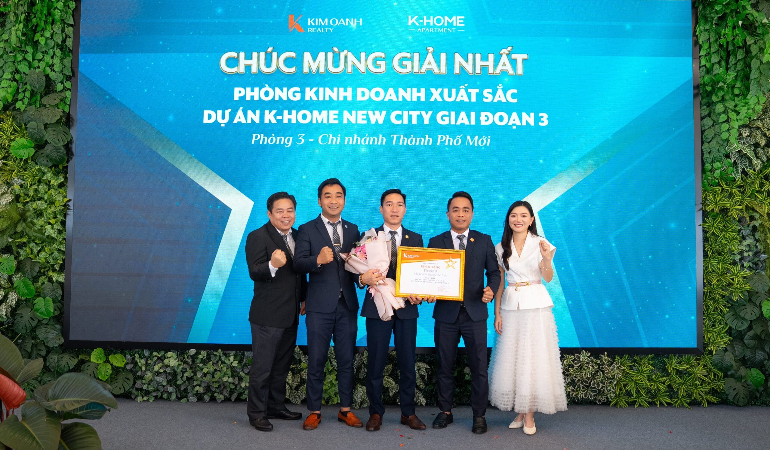Bà Nguyễn Ngọc Ánh và ông Đoàn Vũ Phong trao giải Nhất Phòng kinh doanh xuất sắc trong chiến dịch K-Home New City giai đoạn 3 cho Phòng 3 – Chi nhánh Thành Phố Mới.