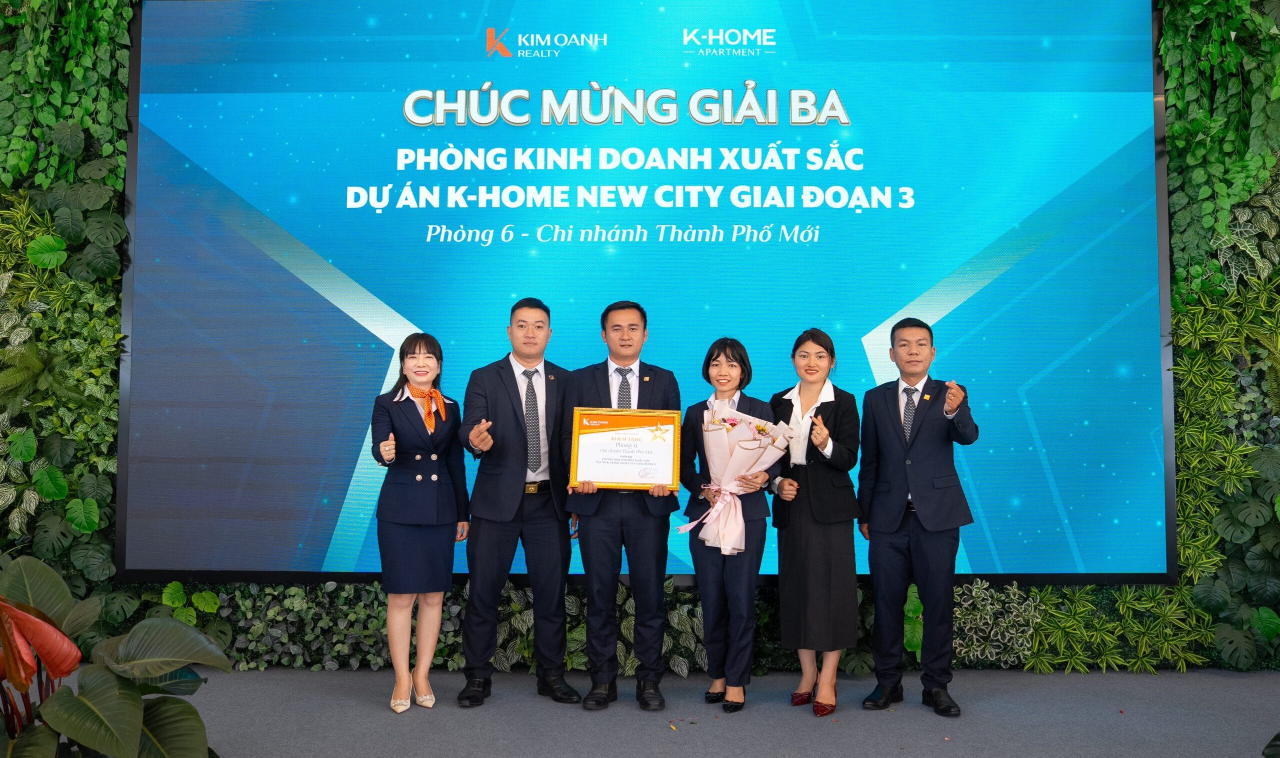 Bà Lê Thị Hạnh và ông Nguyễn Tấn Sự trao Giải Ba hạng mục Phòng kinh doanh xuất sắc trong chiến dịch K-Home New City giai đoạn 3 cho Phòng 6 – Chi nhánh Thành Phố Mới.