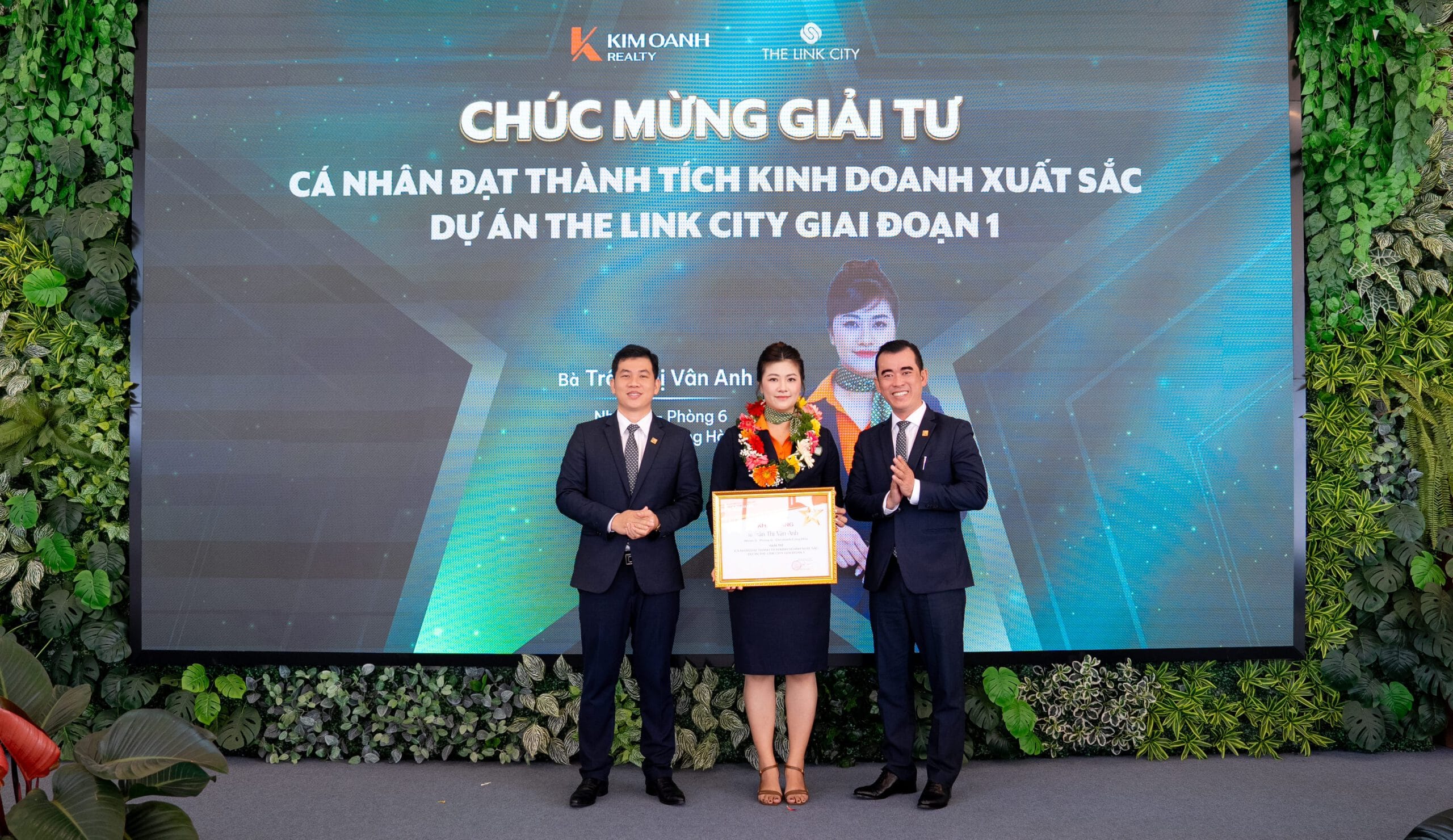 Không dừng lại ở K-Home New City, đội ngũ Kim Oanh Realty tiếp tục giữ vững phong độ trong dự án The Link City. Trong ảnh, bà Nguyễn Ngọc Ánh và ông Tôn Thất Khiêm trao Giải Nhất cá nhân đạt thành tích xuất sắc trong chiến dịch The Link Ctiy giai đoạn 1 cho ông Nguyễn Đức Khoai – Nhóm 2 – Phòng 5 – Chi nhánh Thành Phố Mới.